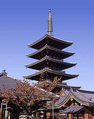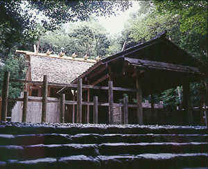 The interior of Japanese houses in the past was virtually open, without even screens to partition off individual spaces. Gradually, as more thought was given to particular areas and their functions, such as eating, sleeping or dressing, self-standing screens (byobu) came into use. Paper-covered sliding doors (shoji or fusuma), which we still find in traditional homes, came afterwards. Though they serve poorly as sound barriers, they do provide some privacy and can be removed to open up the entire space (except, of course, for the columns that support the house). Shoji also admit light. The way in which Japanese view the interior and the exterior of the house is another key aspect of traditional design. Instead of seeing the inside and outside as two distinctly different environments, they are thought of as being continuous elements. This concept is embodied in the Japanese veranda (engawa) which acts as a kind of transition space from inside to outside the house. Nure-en, which is fixed to the side of the house and gets wet when it rains, is a variation of the engawa. From an aesthetic standpoint, the traditional house is designed for people who are seated, not standing. Doors, windows and alcoves are placed so that both artwork in the house and the garden outside can be viewed appropriately from a sitting position. Despite the changes that modernization has brought to the style of houses, the traditional Japanese style has not vanished. Even in the Westernized houses, it is still usual to find a room whose floor is covered over with tatami (the Japanese mat), and it is still the custom for people to remove their shoes before entering the house. Shinto Architecture